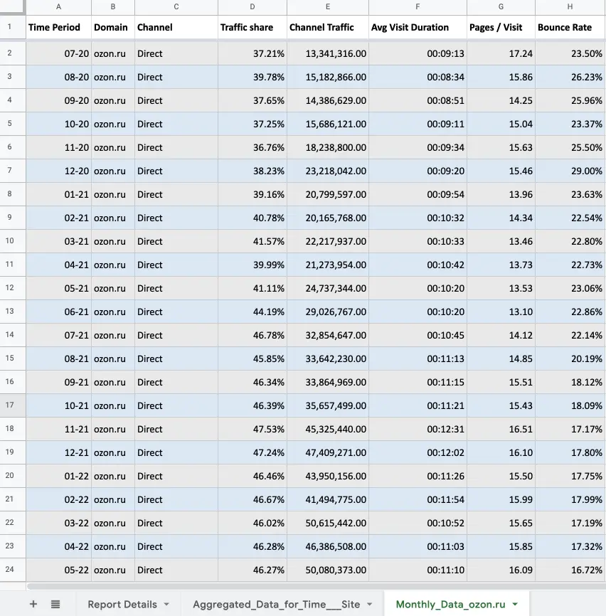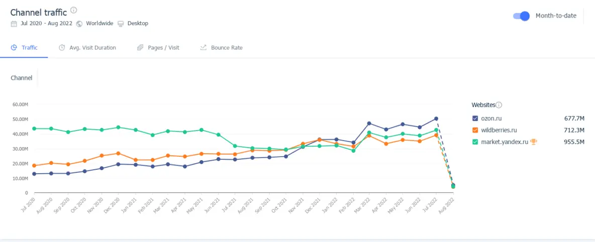 Трафик из поисковых систем для Ozon, YaMarket, WB за последние 2 года по данным SimilarWeb. OZON