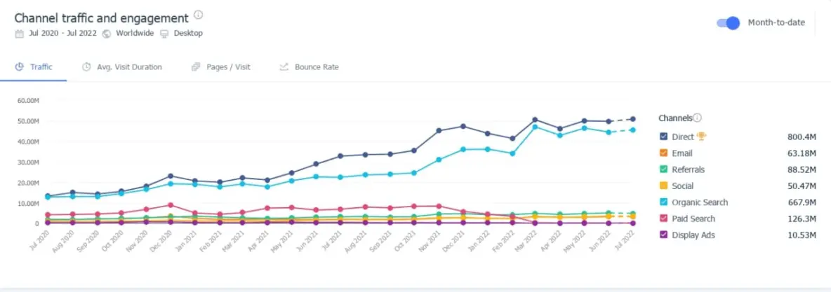 Рост трафика на Ozon.ru по каналам — июль 2020 к июлю 2022, данные SimilarWeb