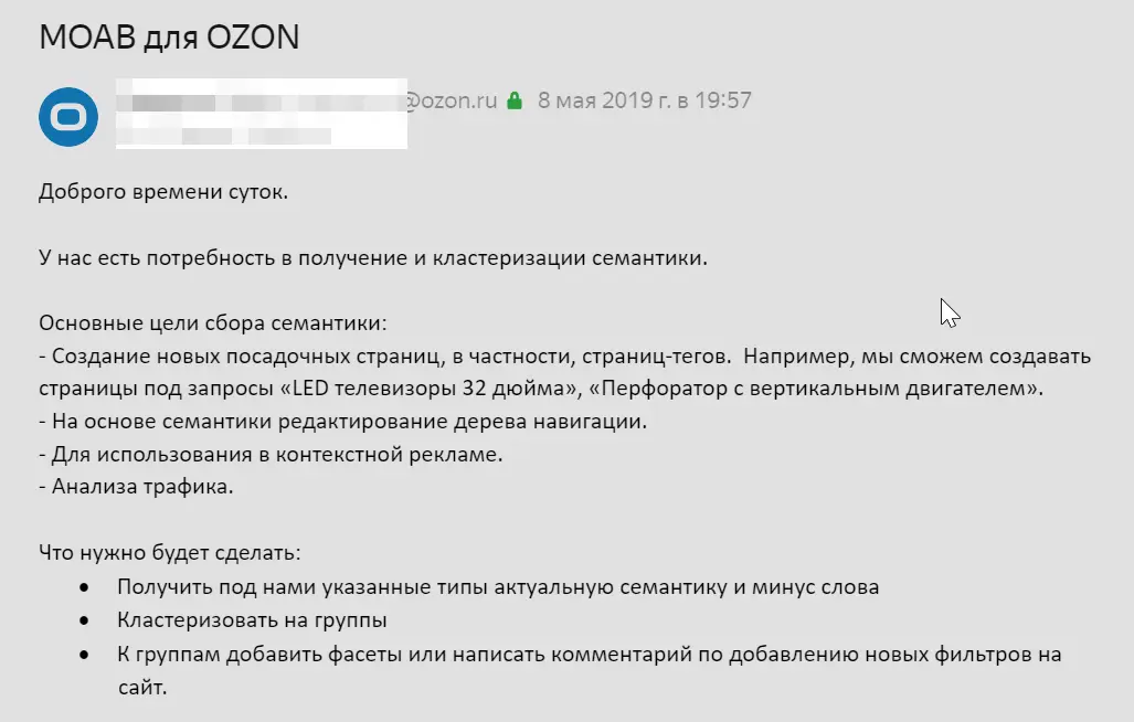 Собрать всю возможную семантику для OZON, кластеризовать, написать мета-теги, подготовить файлы с кластерами для публикации. Собиралась как коммерческая семантика для основного проекта Ozon.ru, так и информационная — для проекта OZON Клуб.