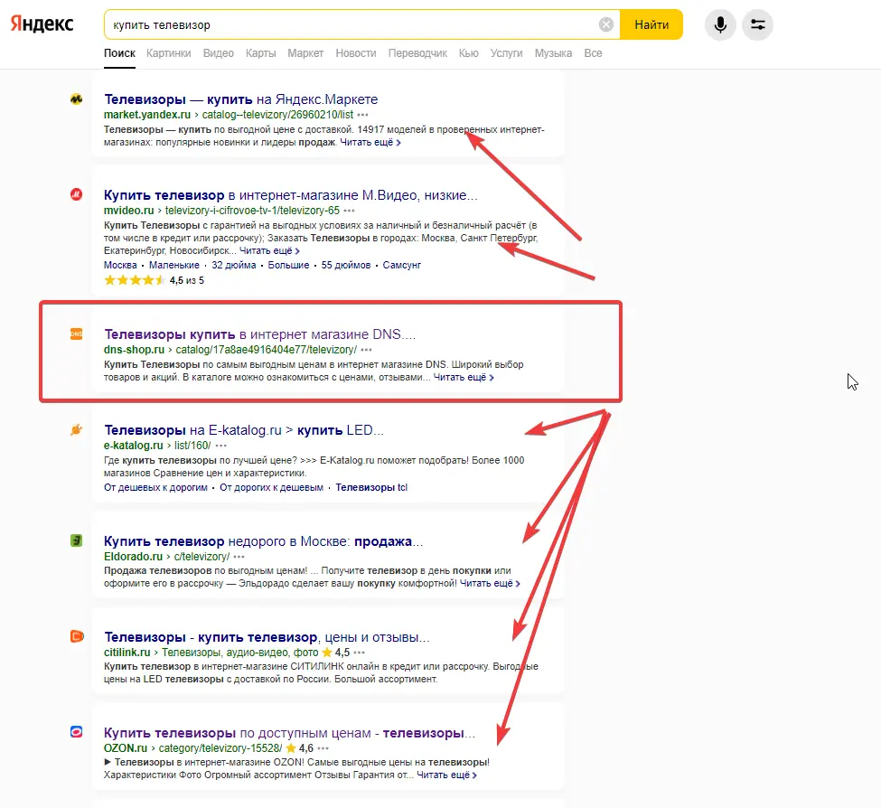 Сервис обнаружит, что данный URL ранжируется по запросу «купить телевизор», и в этом же SERP присутствует еще 9 URL:
