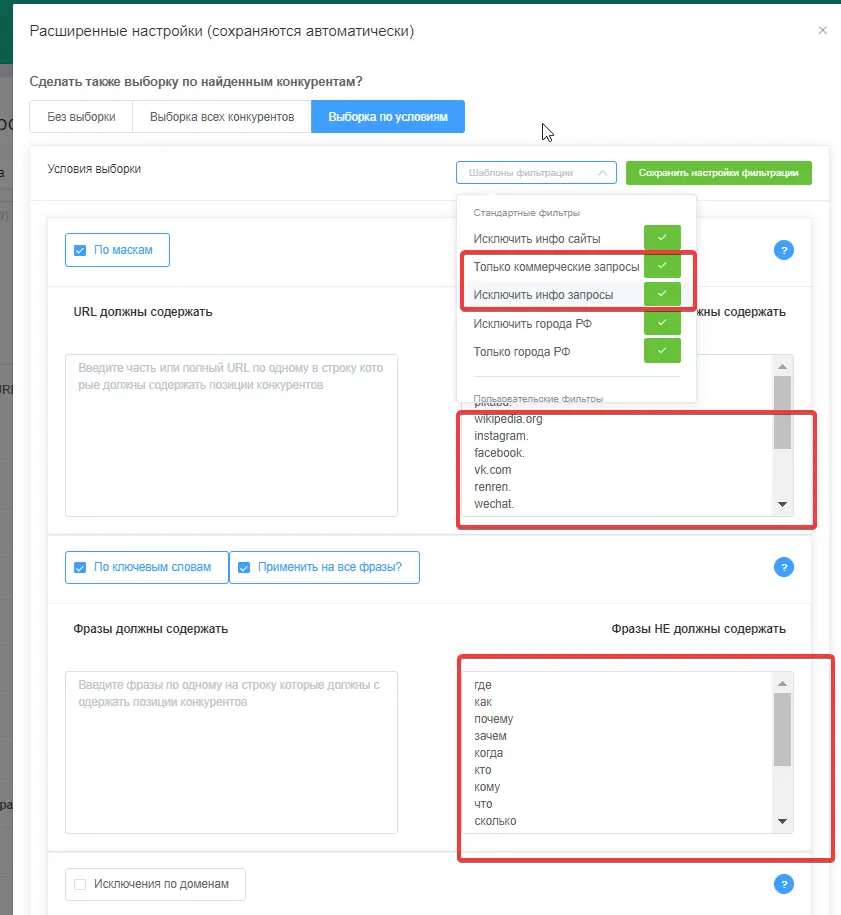 - Чтобы сохранить максимальную выборку, но сделать ее точнее, используйте расширенные настройки — например, при помощи готовых пресетов. Использование пресетов «Исключить инфозапросы» и «Исключить инфосайты» позволит получить максимально чистую выборку.