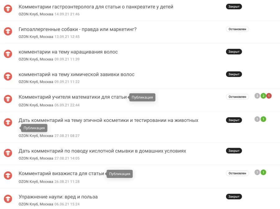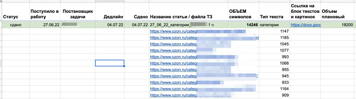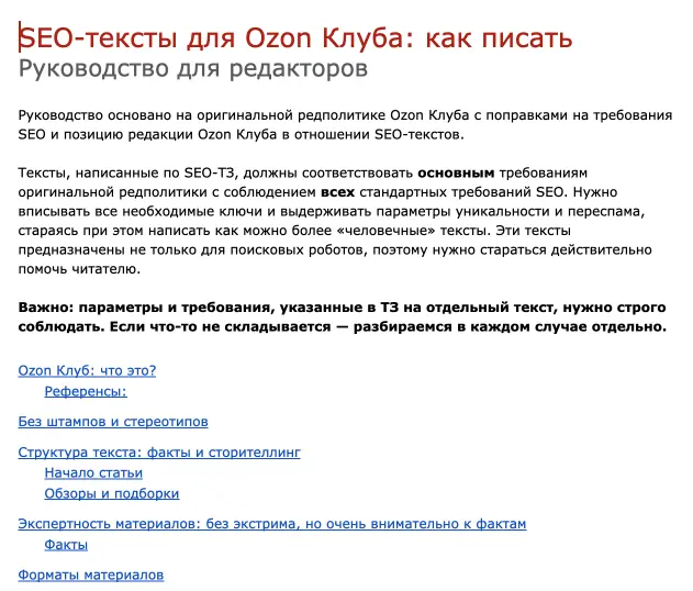 Как обычно, в большом проекте пишется много SEO-текстов. Мы начали в декабре 2020 и выдавали до 1-1,2 млн знаков ежемесячно. Категории, теговые страницы, тексты для линкбилдинга, статьи на сайт. В мае 2021 работа с текстами серьезно усложнилась, мы начали писать для OZON Клуба.
