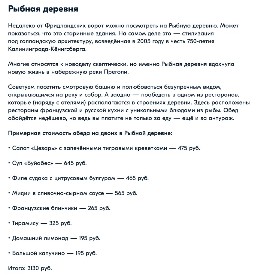 В любой статье по возможности подбирали данные о стоимости товаров, услуг, билетов, примеры блюд в меню ресторанов и пр. Для текстов о путешествиях обязательно было собрать сведения о достопримечательностях, стоимость билетов на выставки и интересные объекты, даже расстояние от города и способы добраться. Иногда сбор данных для текста превращался в настоящее расследование.