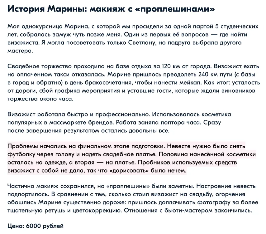Например, вот фрагмент текста про визаж к свадьбе, респондентов для него нашли в соцсети. Девушки с удовольствием рассказали о своем опыте, хотя он и был не самым удачным. В каждой такой истории мы добавляем резюме с советами, как поступить правильно.