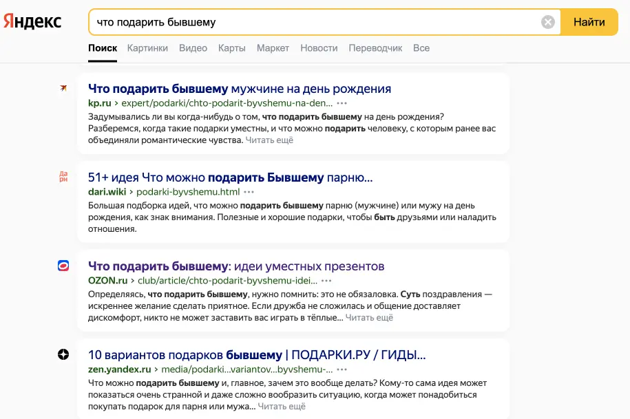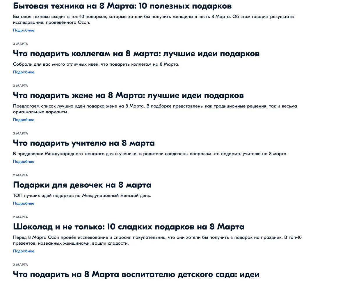 Иногда тексты для Ozon Клуба «выстреливали» в SEO. Например, мы написали около 30 текстов на тему «Что подарить», в списке были даже такие курьезные варианты как «Что подарить бывшему». Эти подборки содержат рекомендации по выбору и перечень товаров, представленных на ozon.ru.