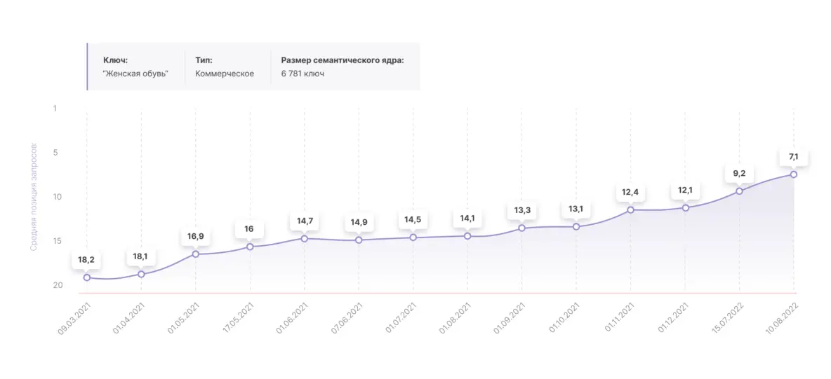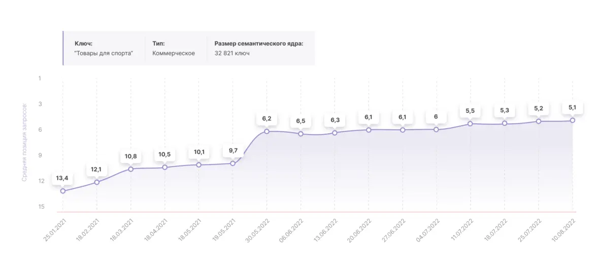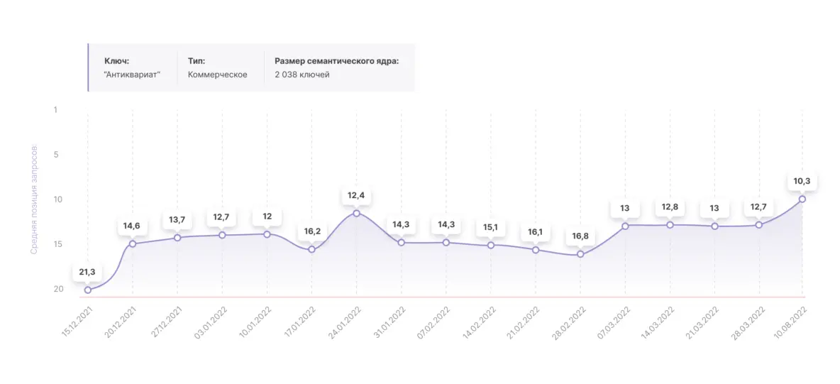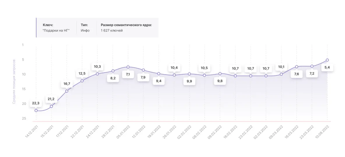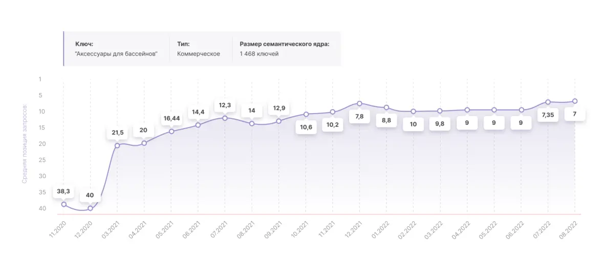 К концу 2021 года исходная задача по расширению семантического ядра была выполнена в полном объеме, сейчас работы над увеличением органического трафика за счет создания новых посадочных продолжаются, однако детали сообщать рано. По всем остальным направлениям работы ведутся в прежнем ключе.