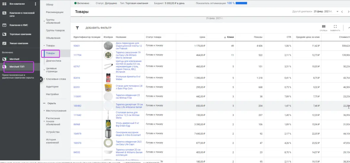 Клиент отобрал топ товаров 2020, которые дали наиболее высокие прибыли. Поставлена задача сделать так, чтобы эти товары были у нас всегда на высших позициях в рекламе. Так как некоторые кампании в Яндекс.Директе, Google Ads по упоминаемым брендам отключены (по просьбе клиента), то оптимальный вариант — работа с Мерчантом.
