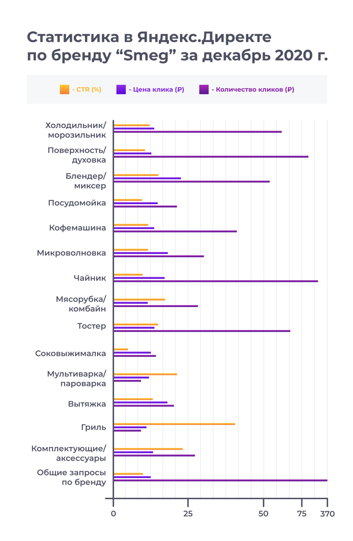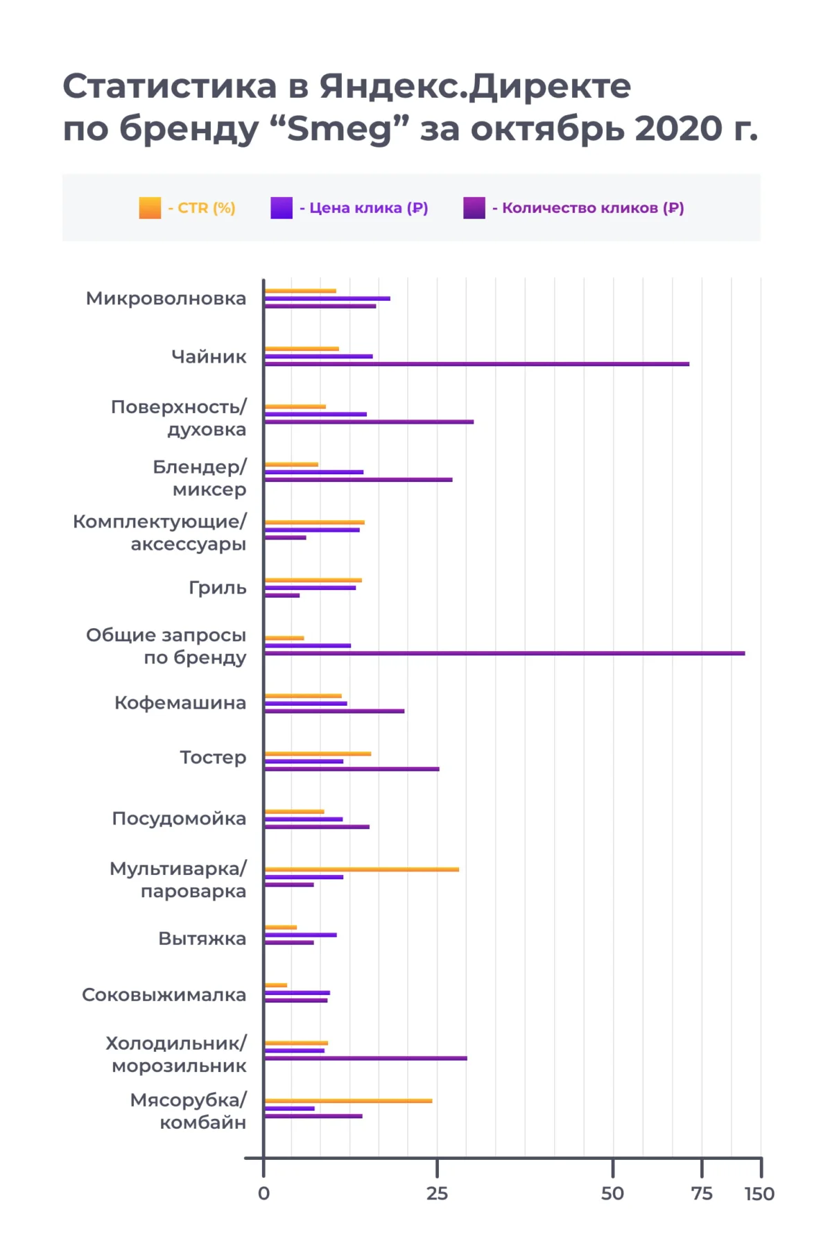 Бренд Smeg: клики, CTR и стоимость клика в Яндекс.Директ по отдельным товарам