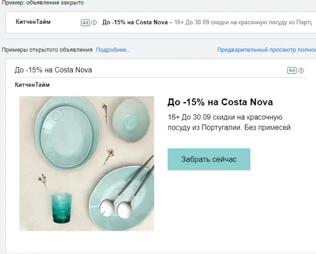 Например, бренд Costa Nova даёт до 15% скидки. Объявление выглядело так: