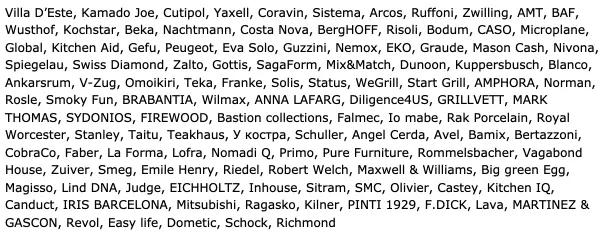 Сейчас (начало 2021) запущена реклама по брендам Cutipol, Yaxell, Costa Nova, Kitchen Aid, EKO, Gottis, Dunoon, BRABANTIA, MARK THOMAS, FIREWOOD, Bastion collections, Rak Porcelain, Bertazzoni, La Forma, Lofra, Smeg, Big green Egg.