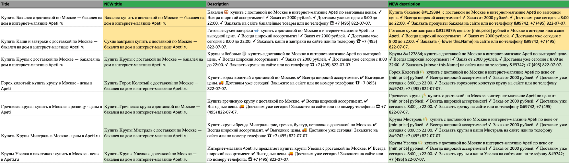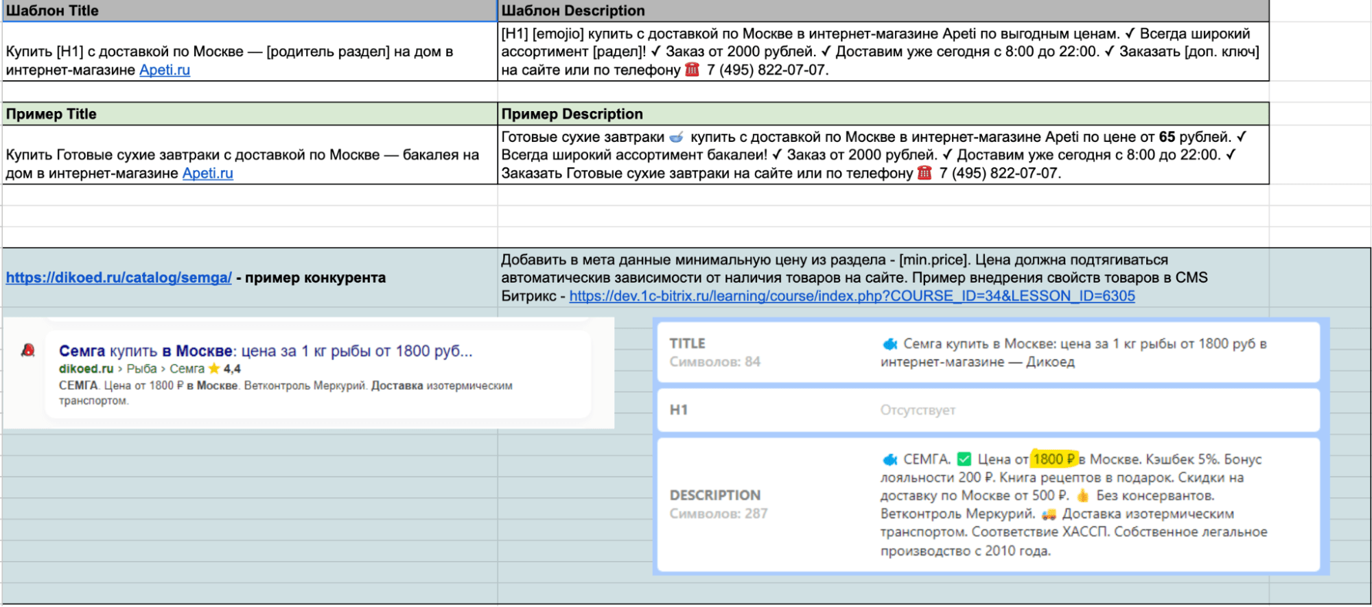 Пример рекомендаций по изменению мета-тегов страниц категорий