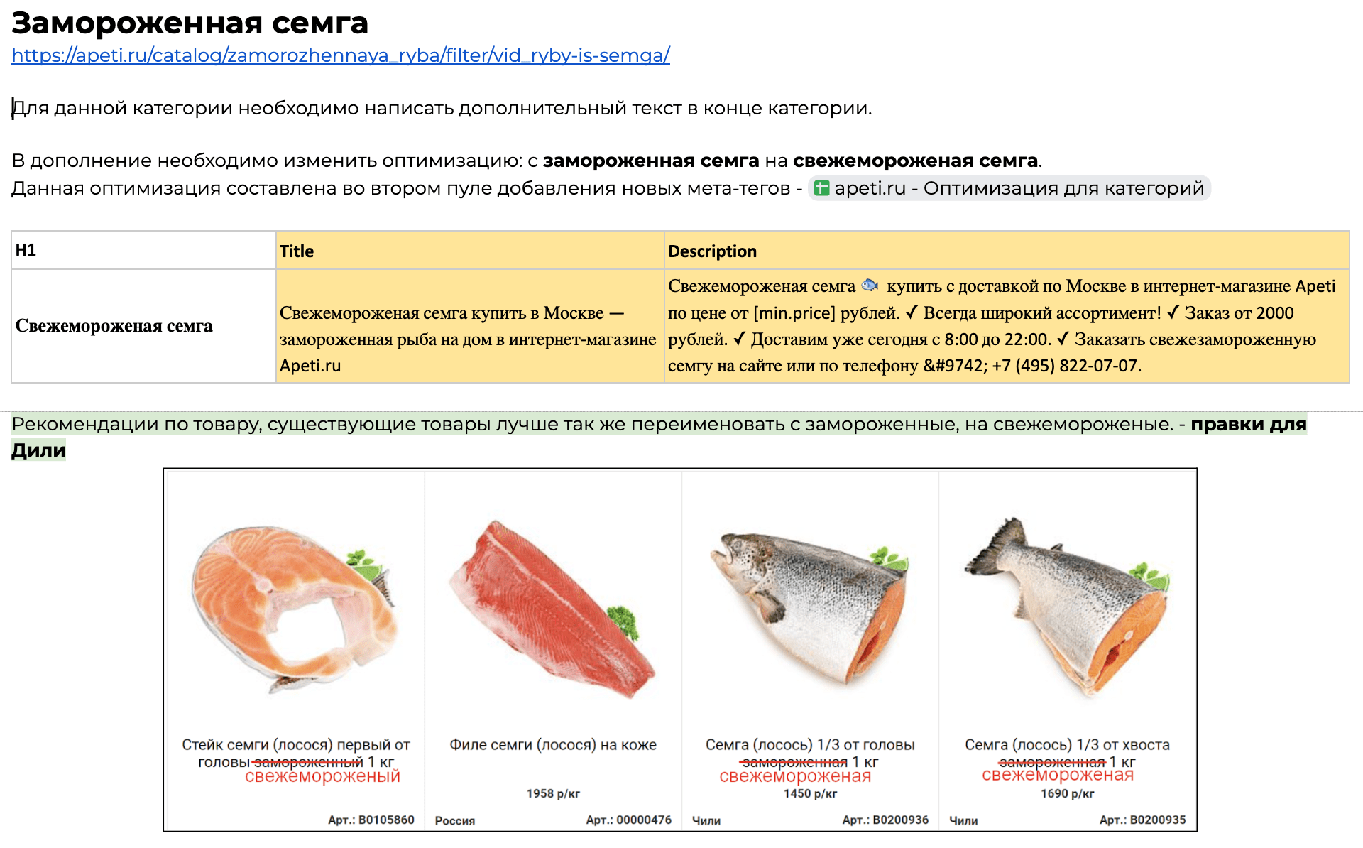 1. Предложили изменить название определенной категории продуктов. Это ТЗ находится на стадии внедрения в команде разработки. Например, семга из замороженной должна стать свежемороженой.