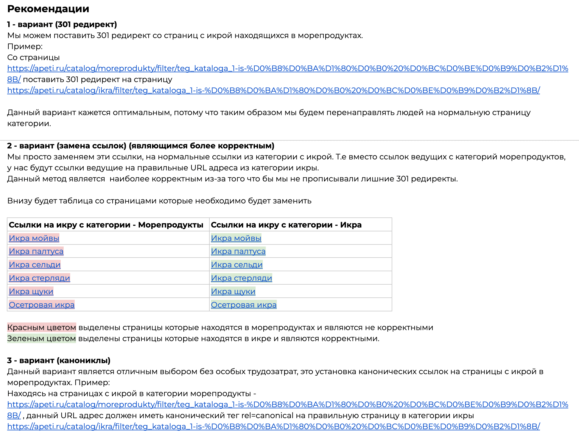 - Провели плановый технический аудит, и дали рекомендации по переезду некоторых страниц из раздела «Икра».