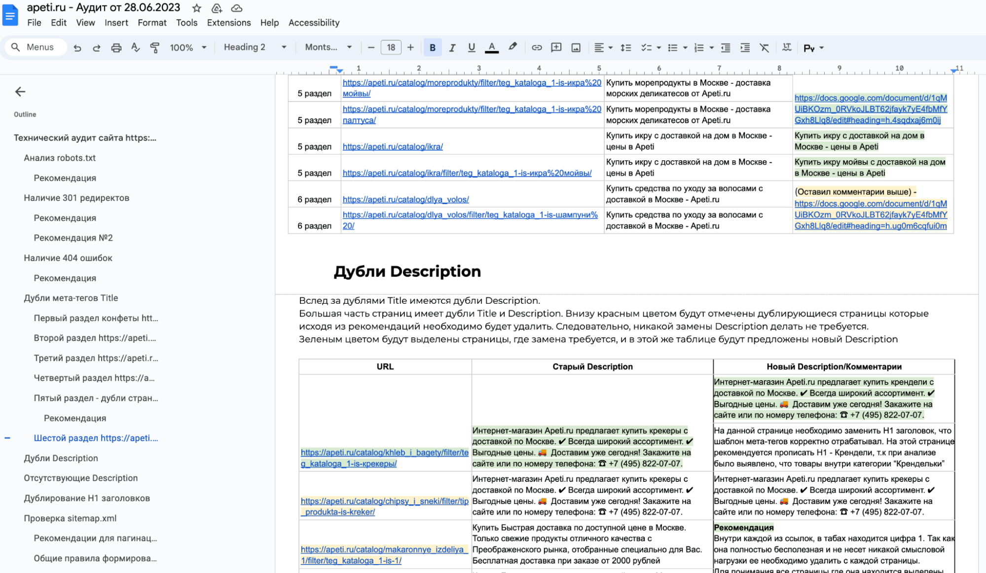 - Составили список страниц, на которых нужно поправить редиректы и снять дубли.