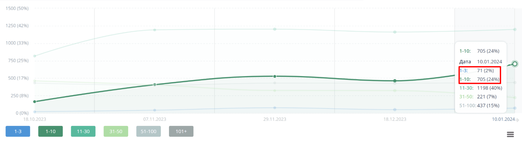 Динамика позиций с октября 2023 по январь 2024 — общая и по запросам — приведена ниже. Как можно видеть, позиции существенно улучшились.