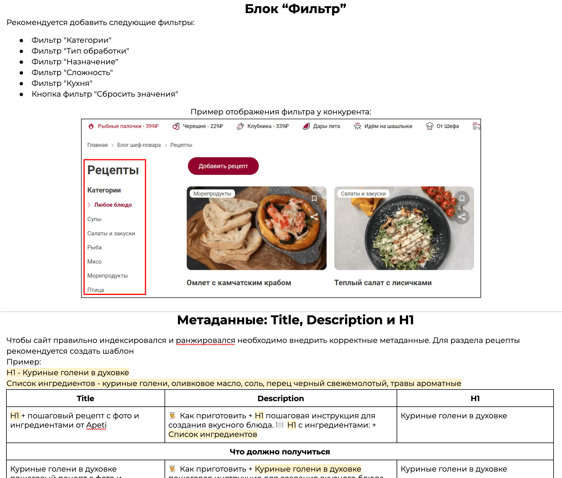3. Разработали страницу «рецептов» для коммерческого подраздела с созданием отдельного файла sitemap и фильтров.