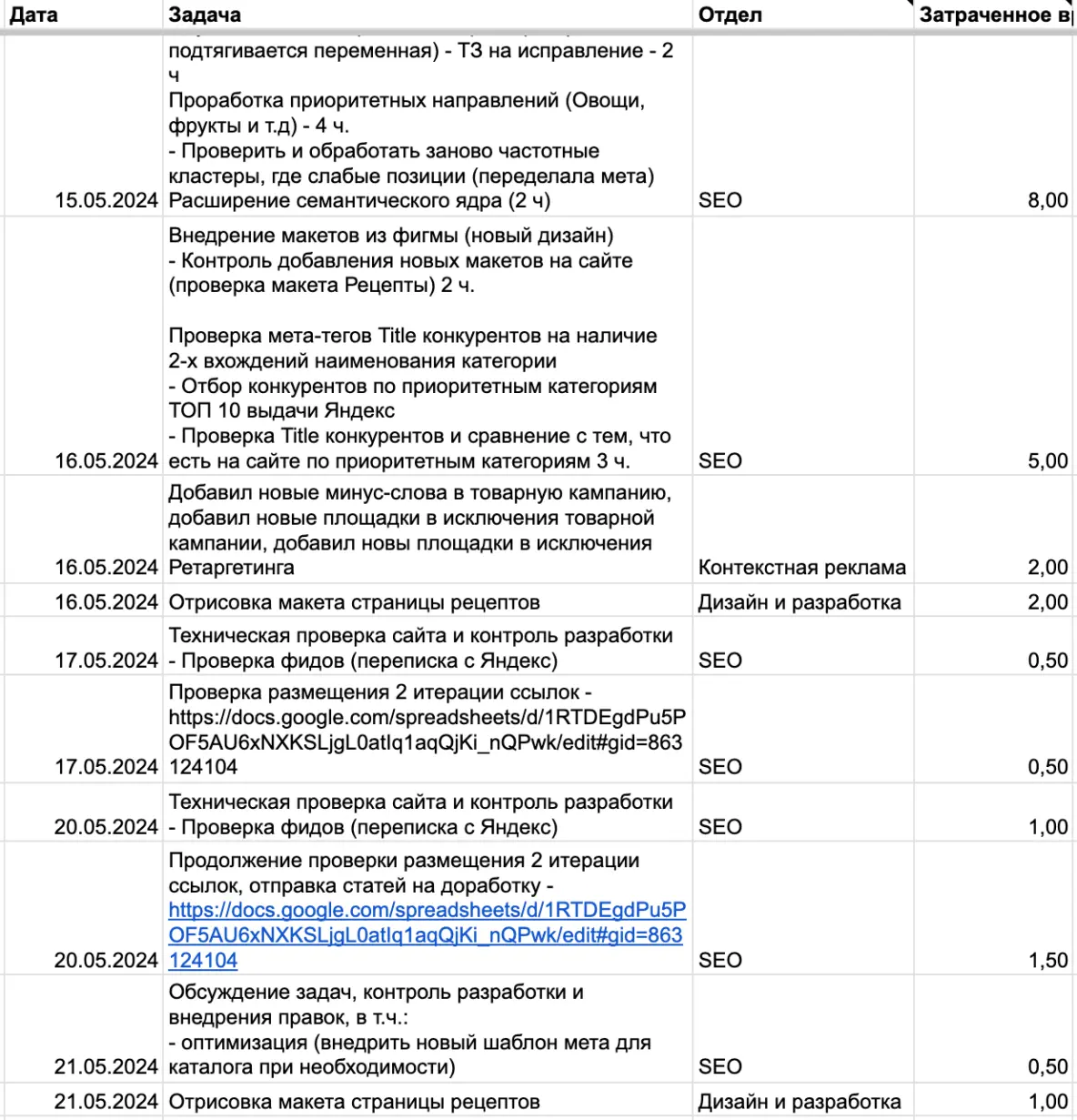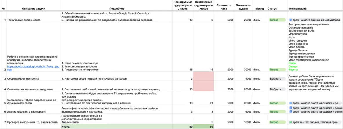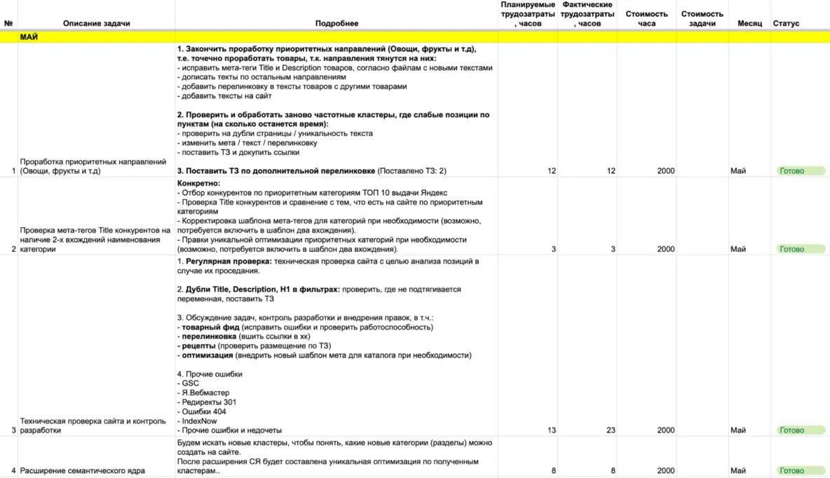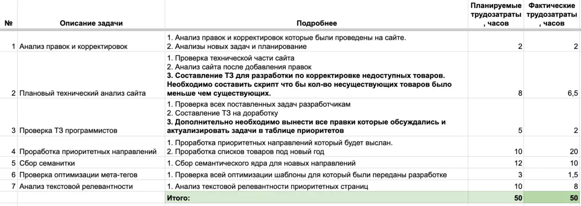 На скриншотах выше можно увидеть, что технический аудит входит в рабочие спринты неоднократно, так же как и сбором семантики специалисты занимались не только на старте, но и после Нового года. Так выглядят нормальные рабочие процессы: ответственный оптимизатор на проекте составляет технические задания и контролирует работу группы из нескольких человек, несет ответственность за свои действия перед клиентом, защищает отчетность — на это нужно закладывать рабочее время.