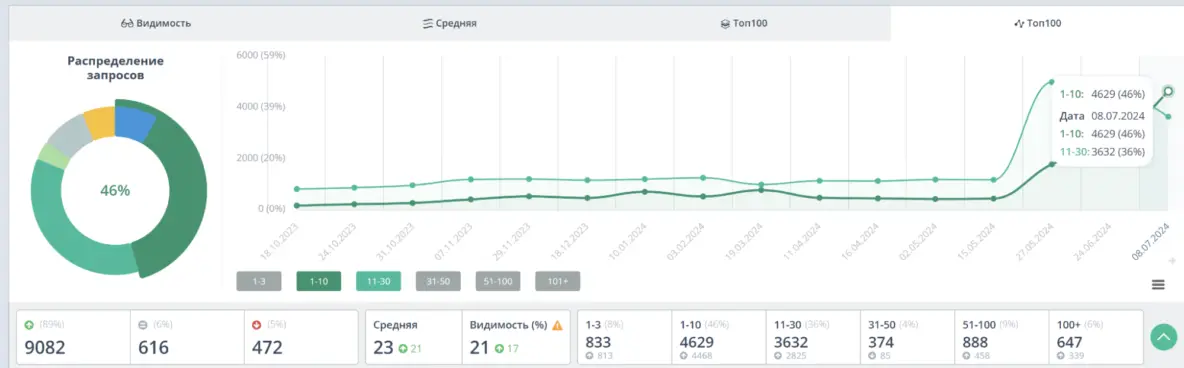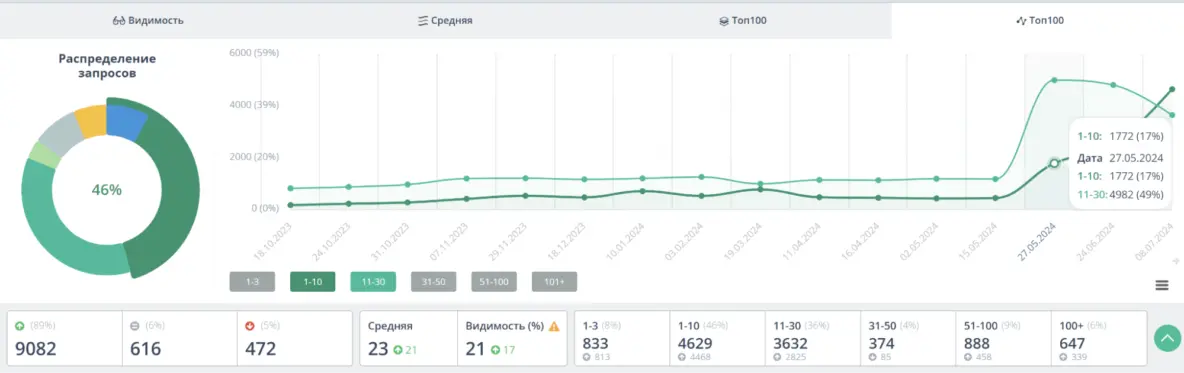 Динамика позиций с октября 2023 по январь 2024 — общая и по запросам — приведена ниже. Как можно видеть, позиции существенно улучшились.