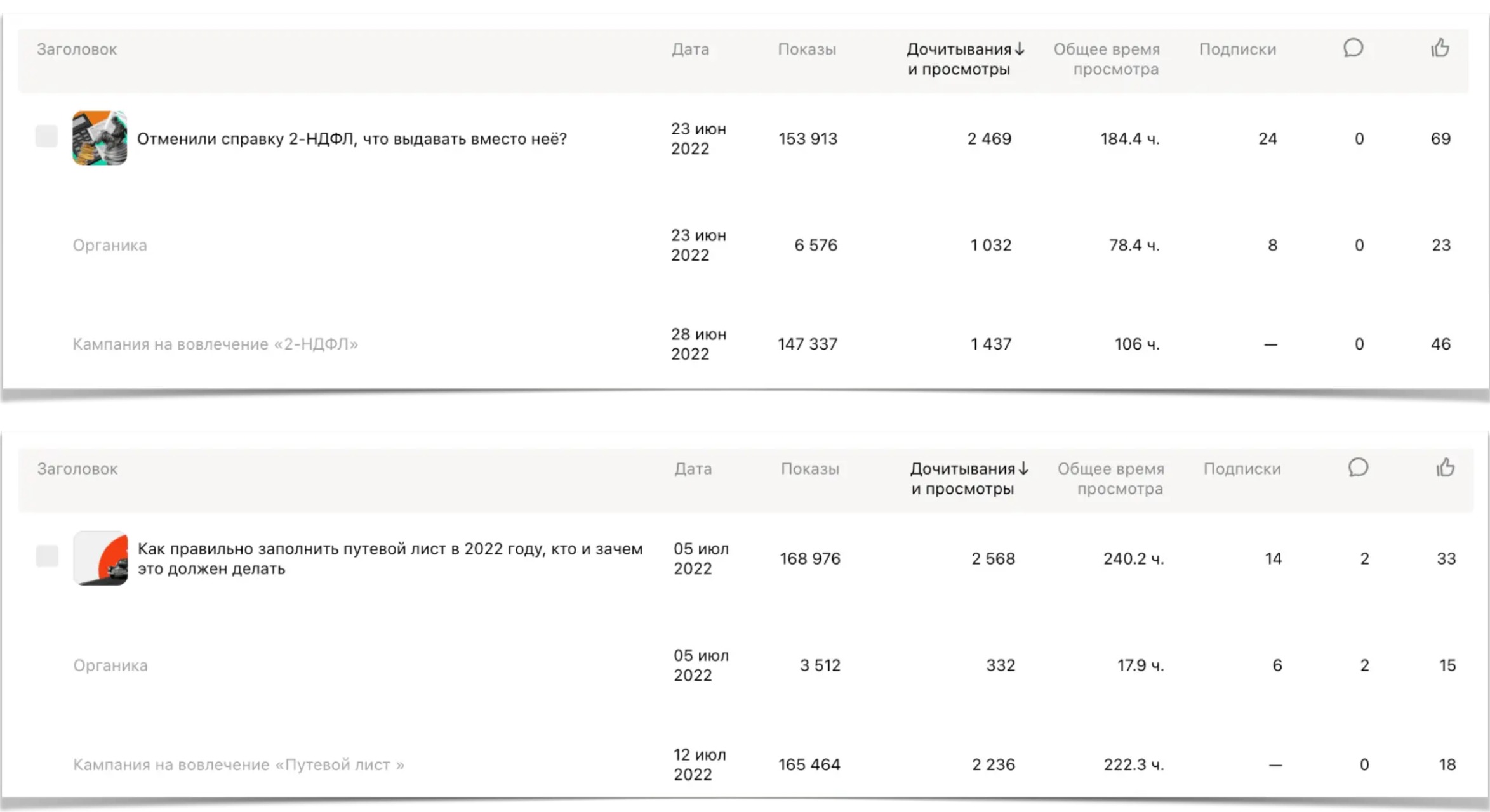 Вот примеры статей, которые резко выстрелили в органике Дзена, а затем очень хорошо открутились в рекламе (карусель):