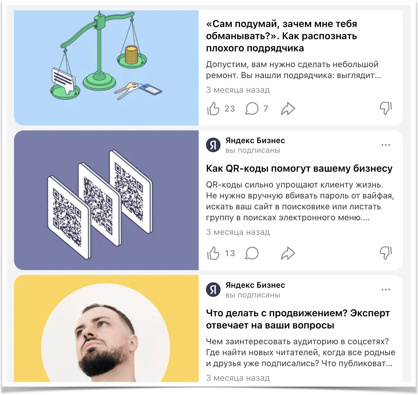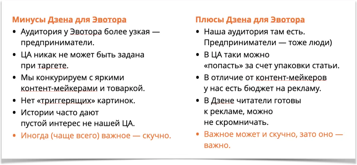 Мы рассудили, что для Эвотора, ориентированного на малого и среднего предпринимателя, Яндекс.Дзен может оказаться хорошим каналом платного трафика. И начали заливать туда статьи «Жизы». Фактически в Дзене (а теперь и ПСЯ) полностью дублируется контент «Жизы». (И нет, потеря уникальности нас не волнует).