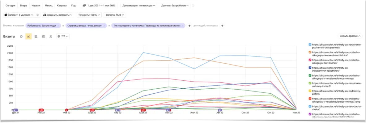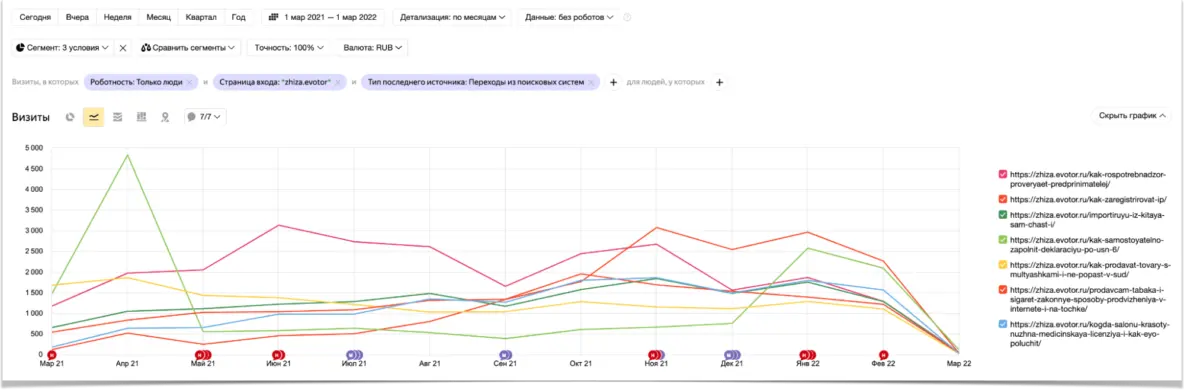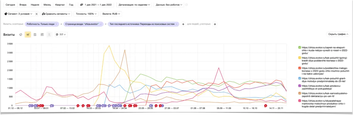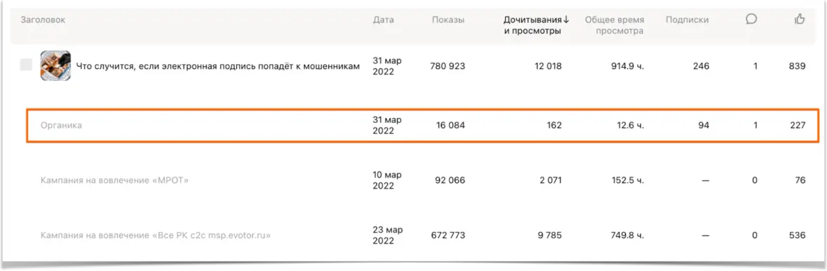 Например, статья о мошенничестве с электронными подписями внезапно начала набирать органический трафик быстрее прочих. Ей уделили больше бюджета на продвижение.