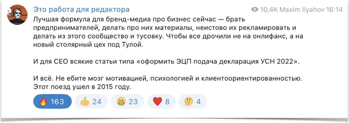 Развитие бренд-медиа нынче — это примерно как владение «Теслой». Кто любит «Теслу»? — Илон Маск и владелец машины. Для них это — образ будущего. С ним иногда не все гладко, но направление верное. Кто смеется над «Теслой»? Примерно все за МКАДом: «Ну, давай, хипстер, поищи зарядку в минус 30 в Брянске». С бренд-медиа — то же самое.