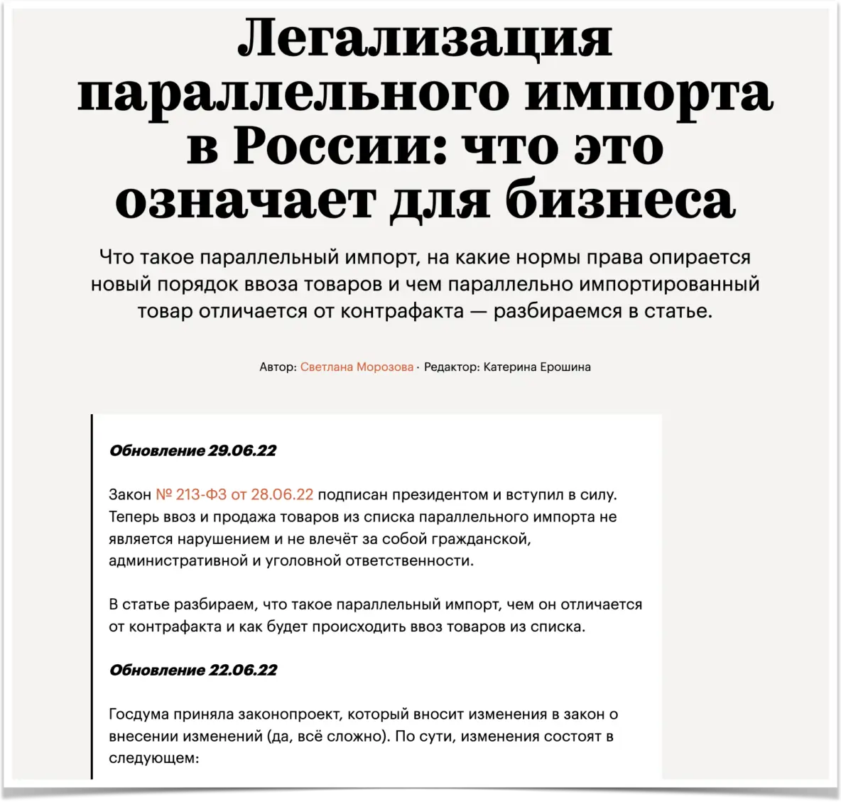 Актуализация контента — процесс, который в любой редакции должен регулярно присутствовать в планах. Сменить «в 2022 году» на «в 2023 году», апдейтить постановления, освежить популярную статью, чтобы она стала еще более популярной, и так далее.