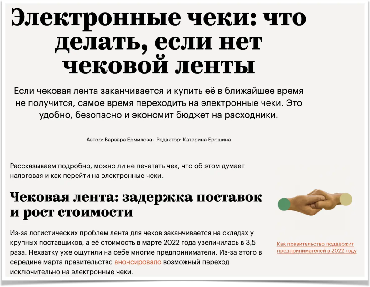 На старте мы совместно с редакцией «Жизы» занялись актуализацией контента. Материалы подбирали из топа по посещаемости и так, чтобы охватить приоритетные сервисы Эвотора. Везде нативно вставляли рекламные врезки. Позднее их вставили во все статьи из ТОП-50 по посещаемости.