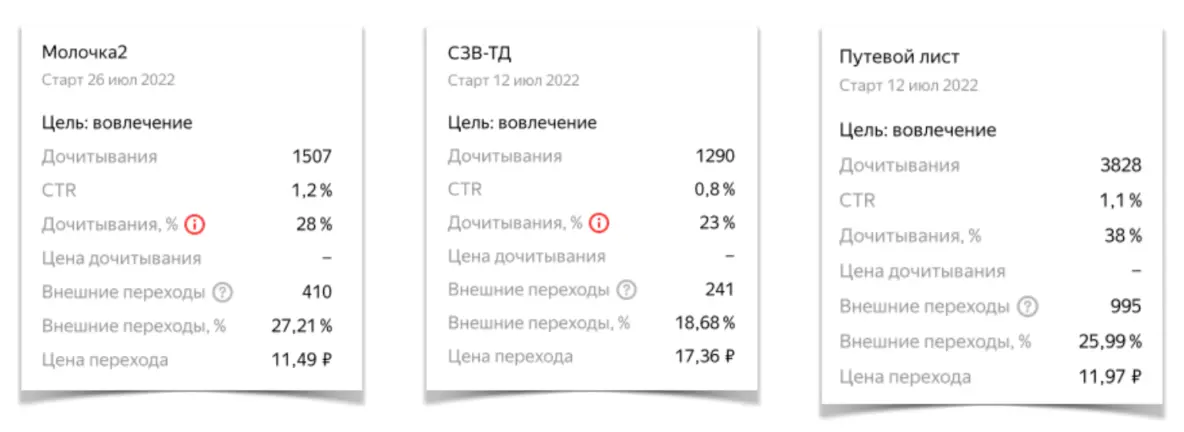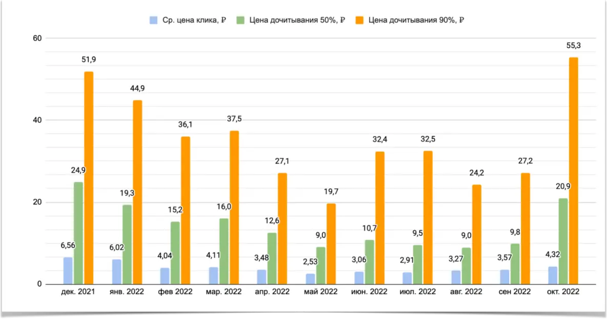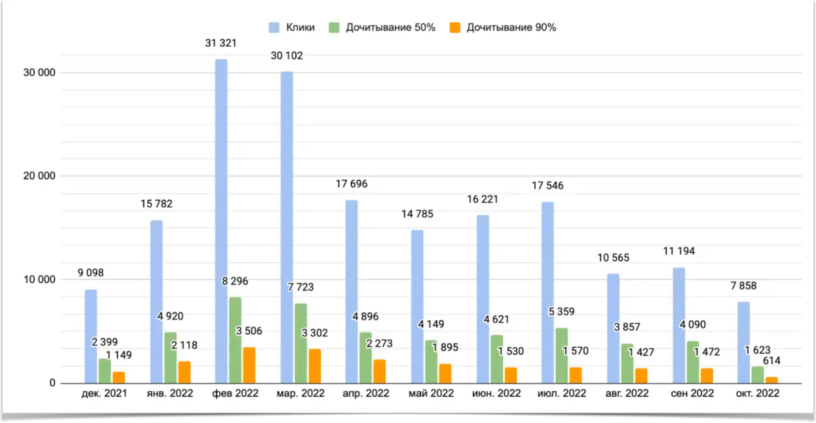 В среднем процент дочитывания-50% держался на уровне 29% от числа кликов, дочитывание-90% — в среднем 12% от числа кликов