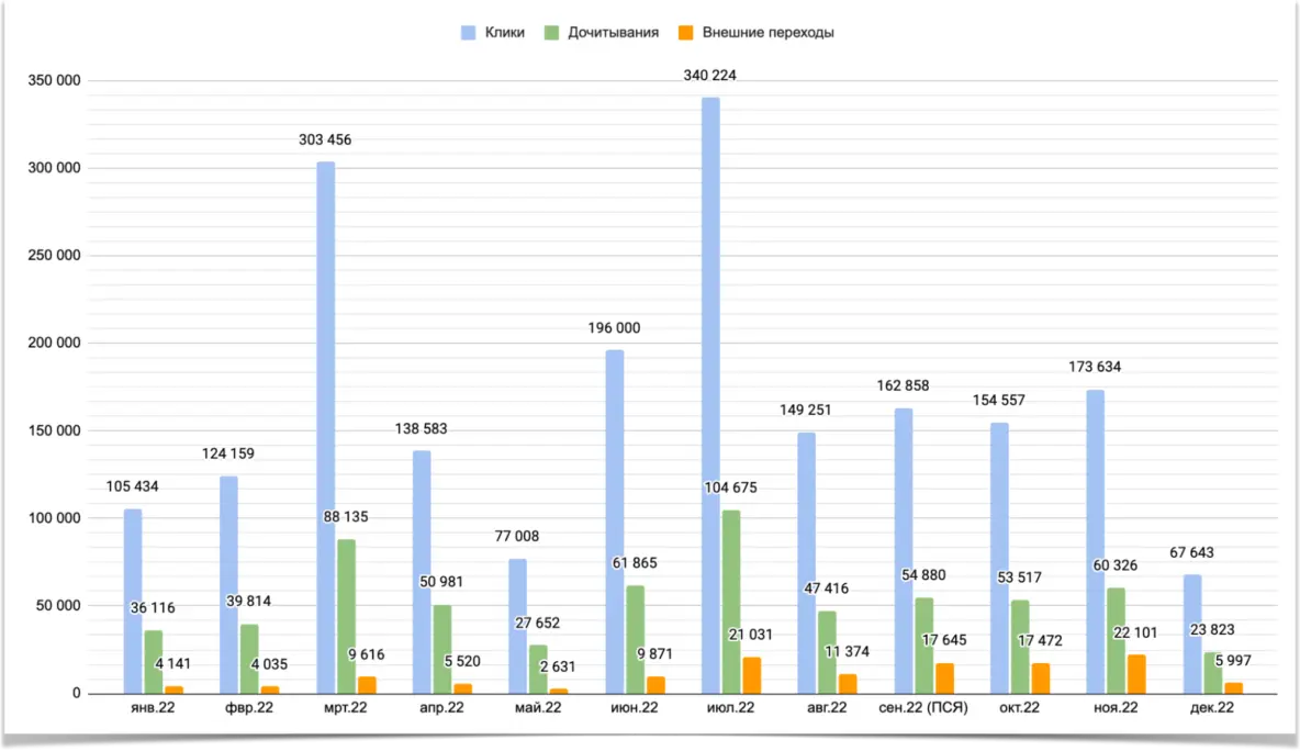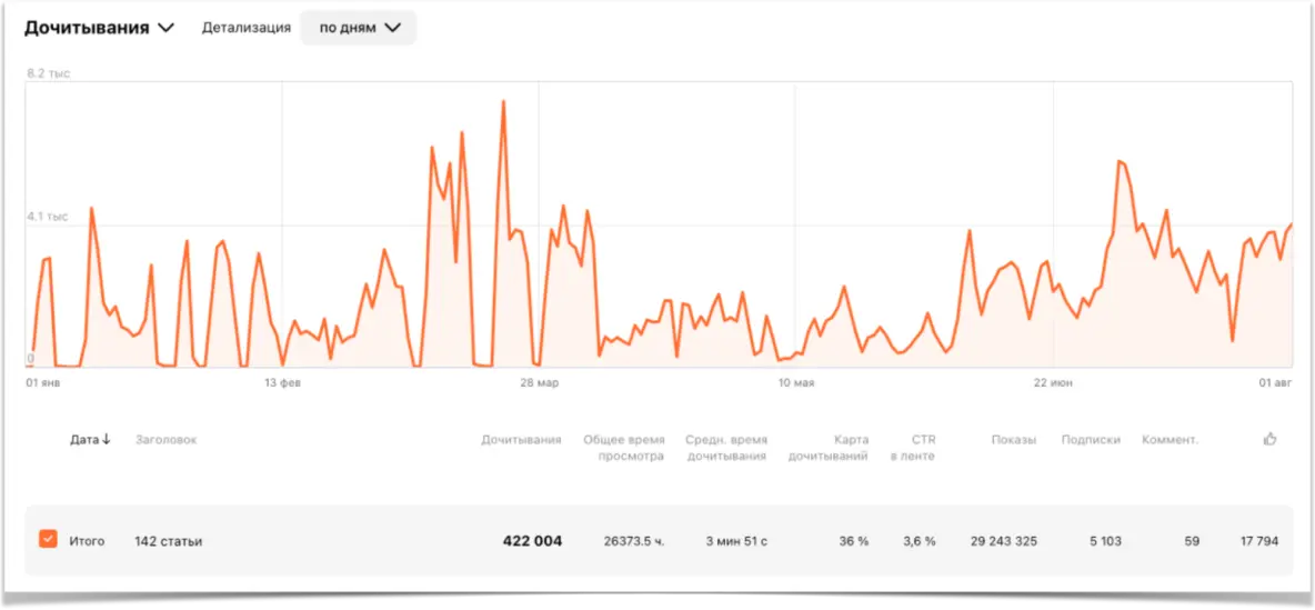 Итог Яндекс.Дзена за весь активный период (янв.—авг.2022): 648,3 тысяч дочитываний, из них 32% посетителей дочитывали до 90% материала.
