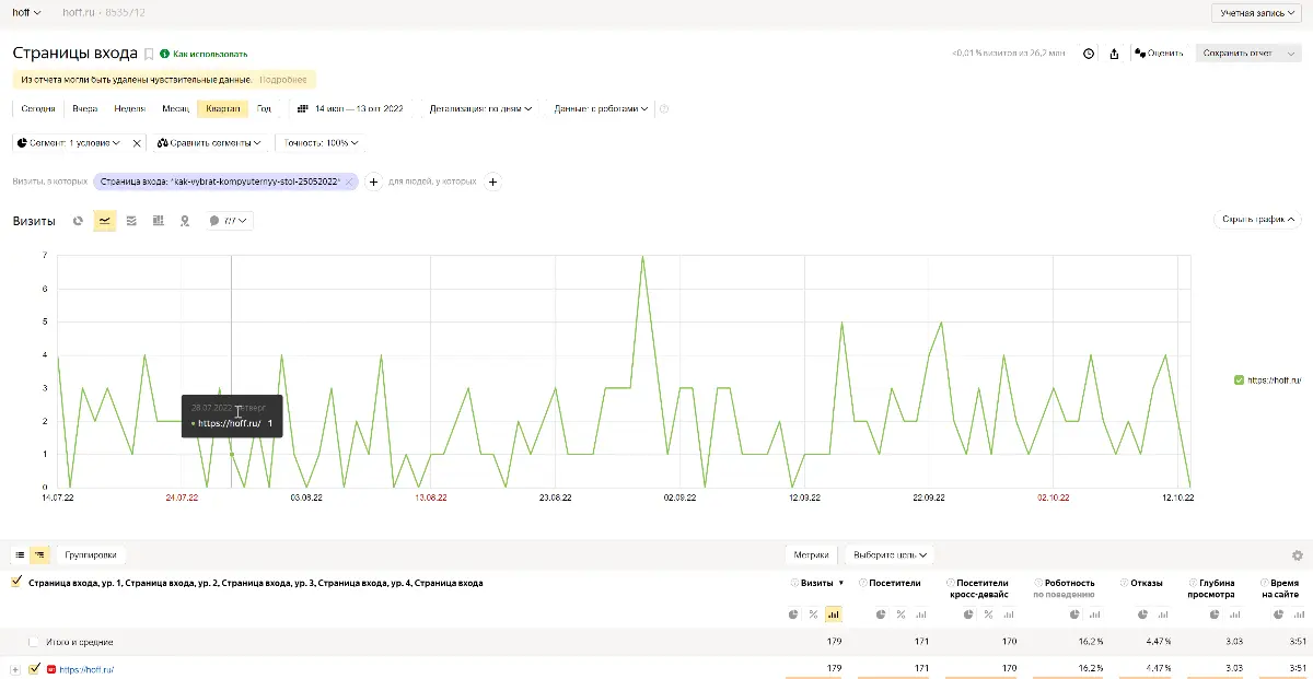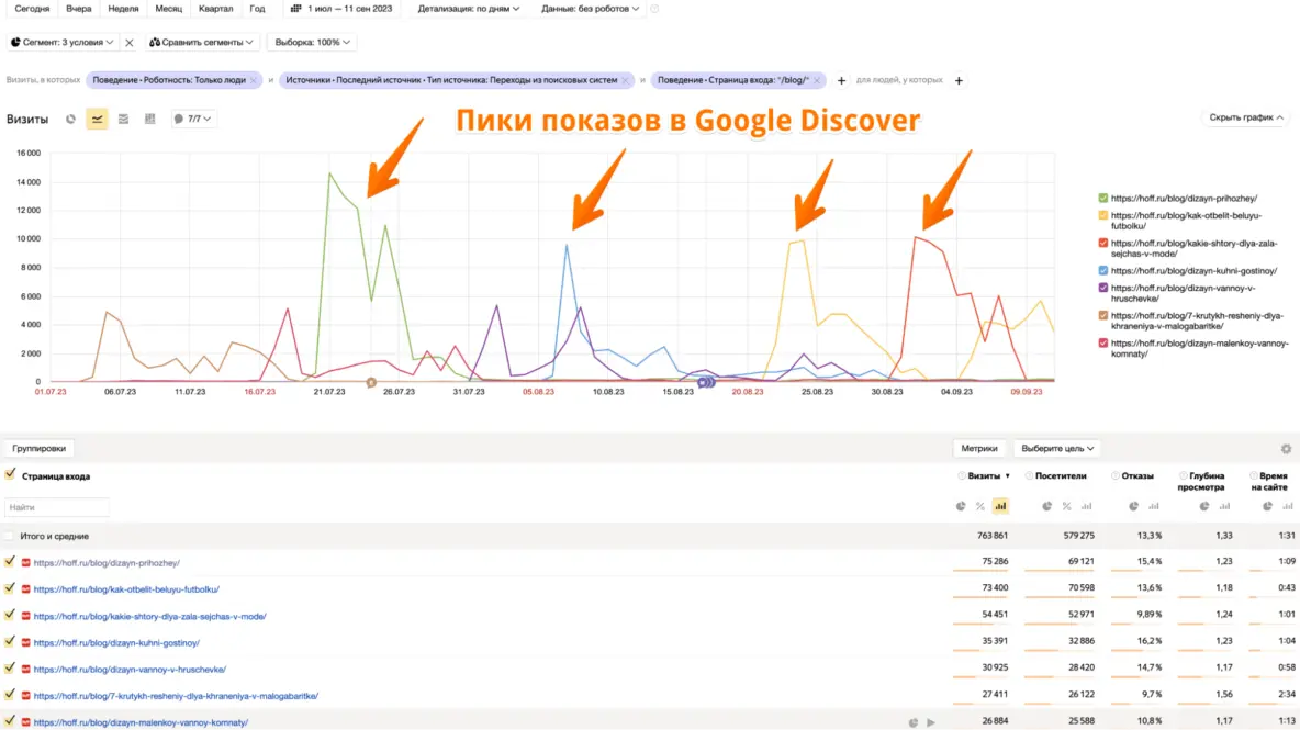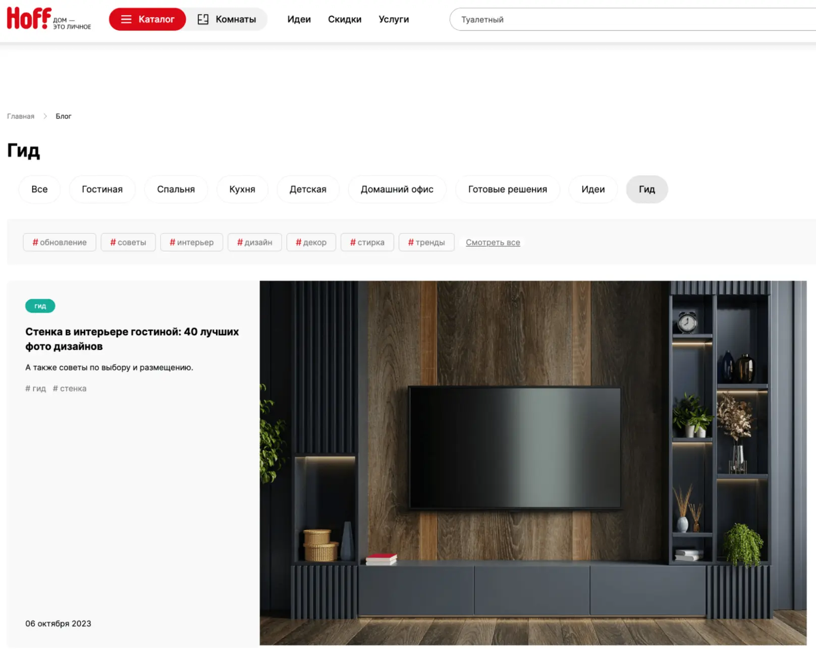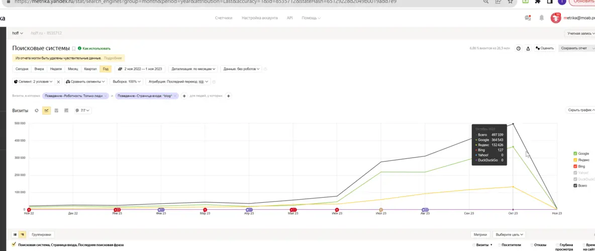 В апреле 2023 г. в блоге Hoff.ru было около 37 000 переходов из поиска в месяц. В октябре, спустя полгода — больше 495 000, рост даже не в десять — в 13 раз.