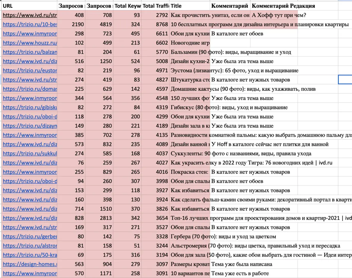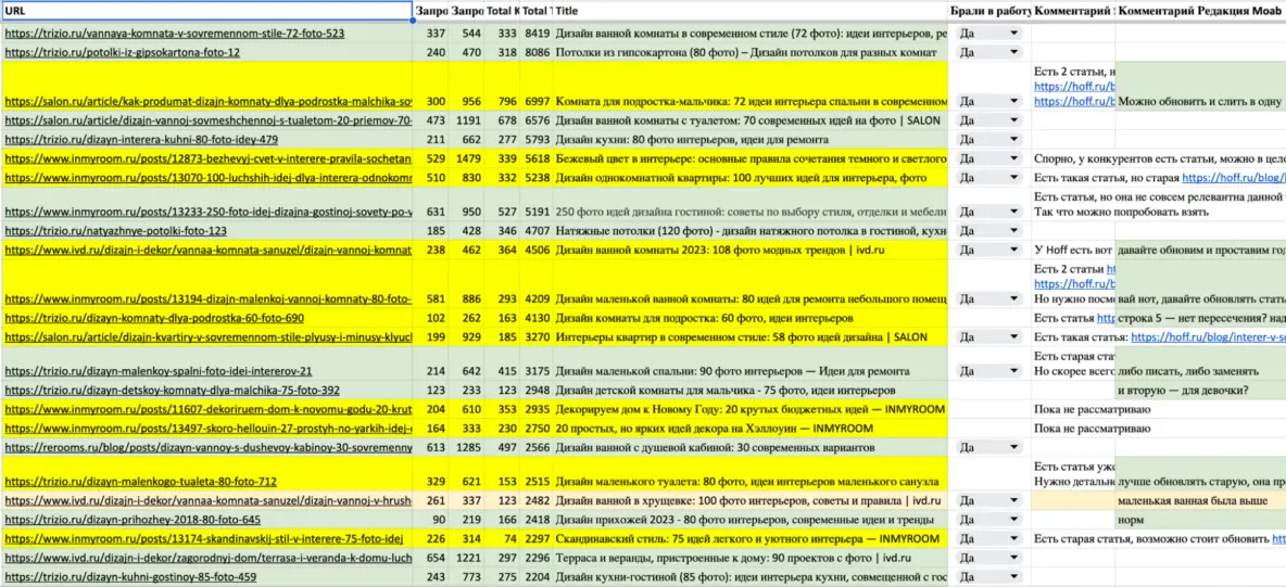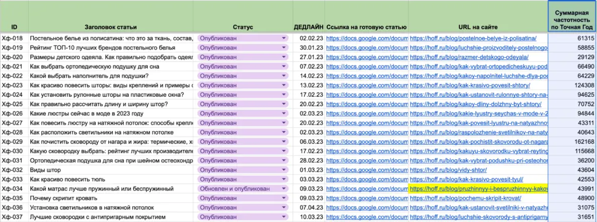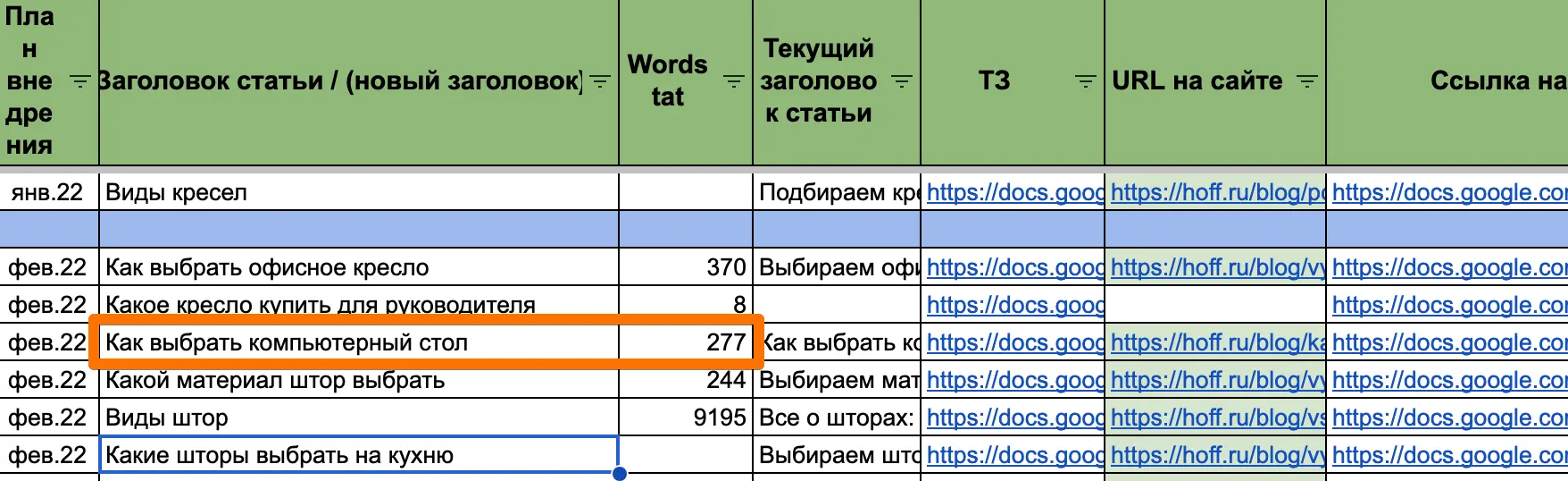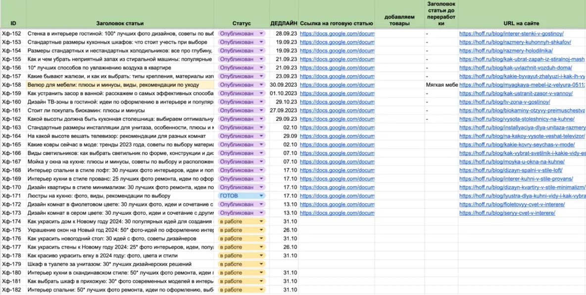 Фрагмент нашей рабочей таблицы по подготовке и выгрузке контента