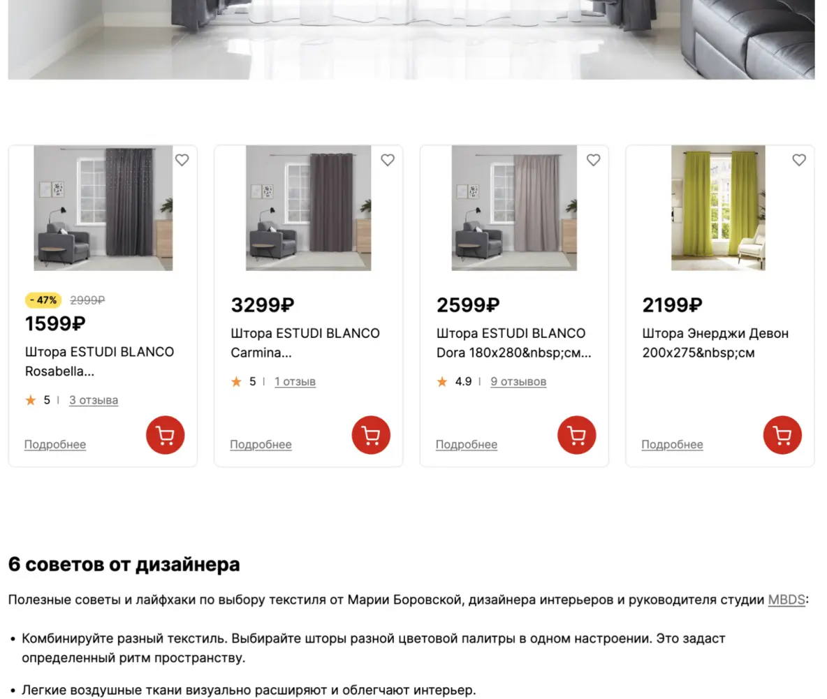 - темы подбираются так, чтобы в статьи нативно интегрировались ссылки на товары из каталога.