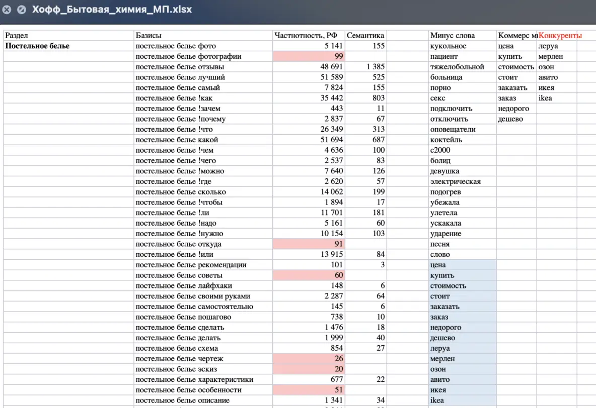 Фрагмент рабочего файла по одному из разделов, минусуются коммерческие слова и слова, задающие посторонние темы