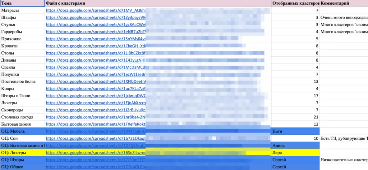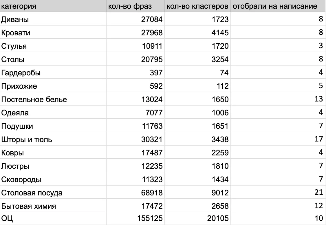 - сбор инфо-семантики, кластеризация и отбор наиболее частотных и релевантных кластеров (тем);