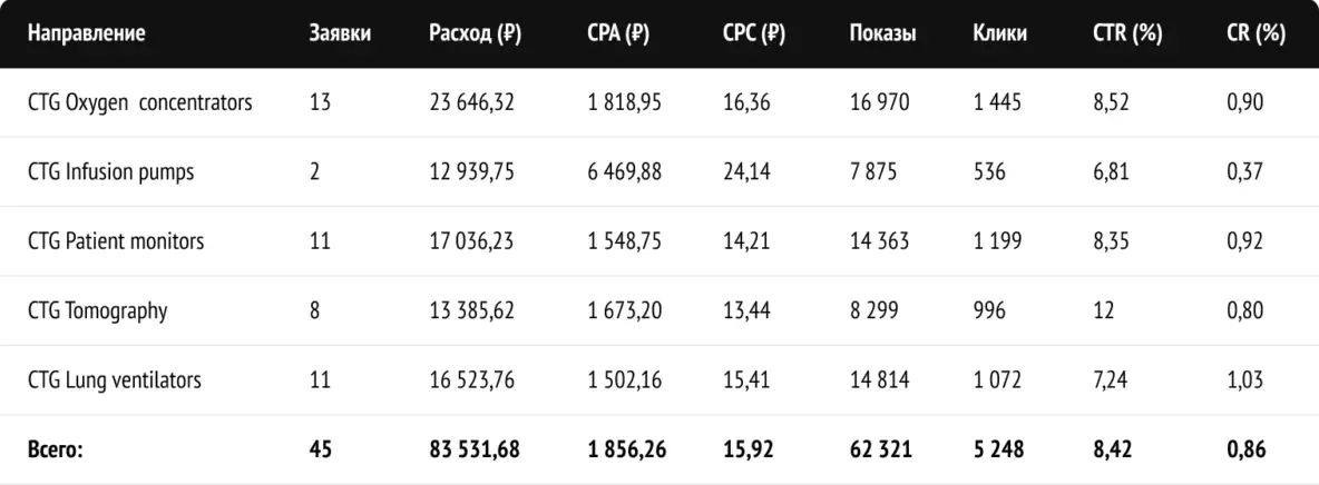 Если подытожить, мы слили 10 тысяч на определение целевой аудитории, затем на 90 тысяч открутили кампании по пяти видам медоборудования.