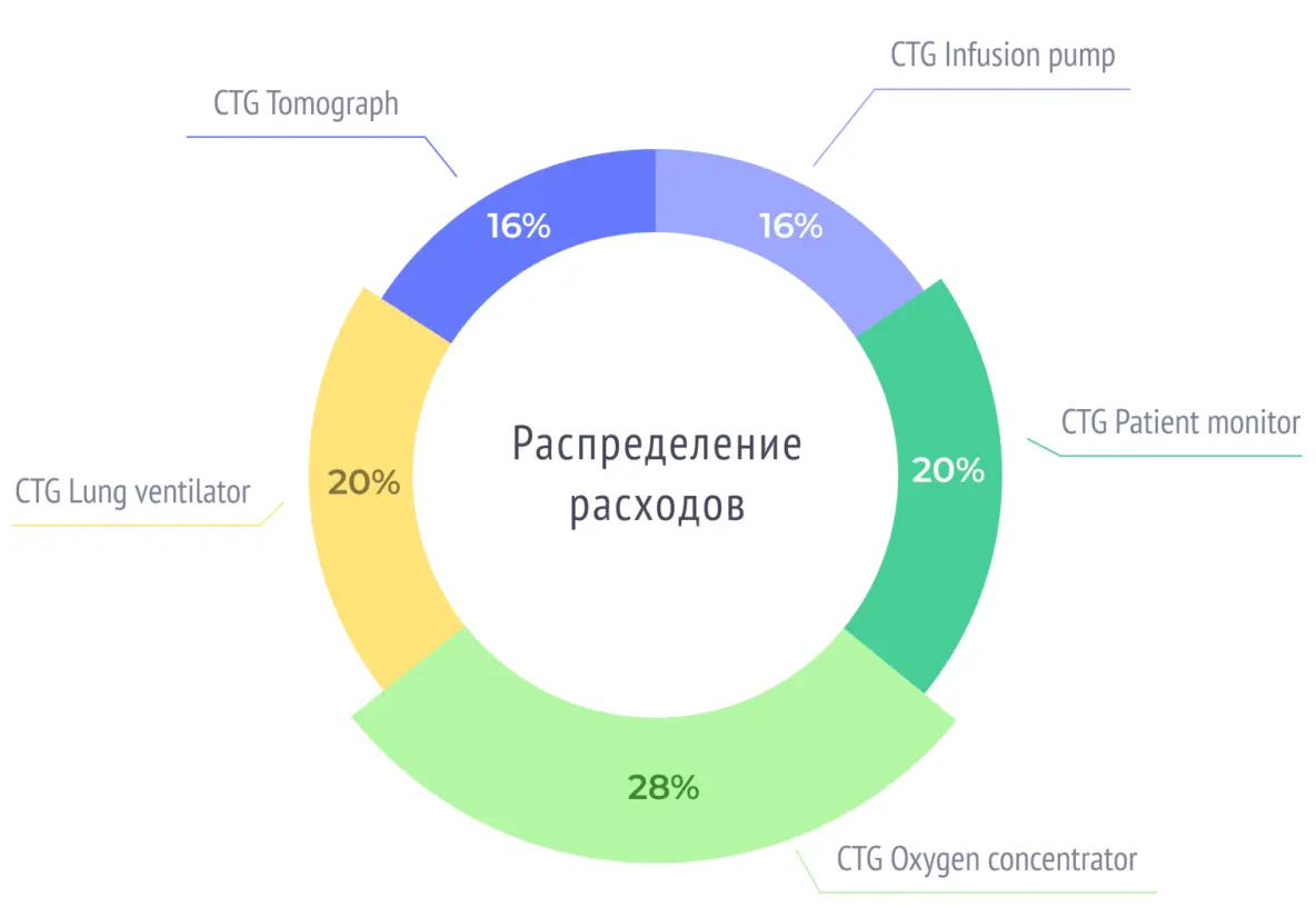 Бюджет распределился равномерно (16-20%). Выделяются только концентраторы кислорода (28% — что в точности соответствует объему трафика).