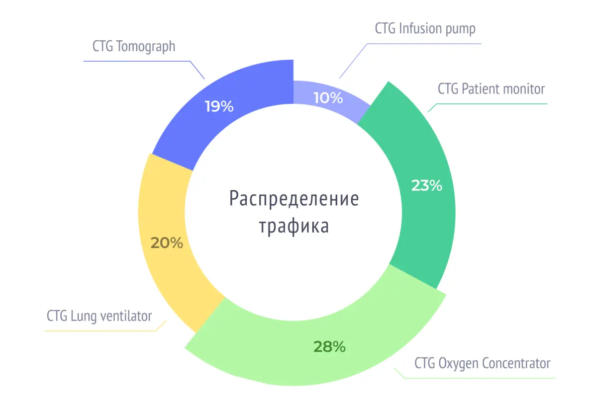 Две категории выделяются из общей картины: концентраторы кислорода и инфузионные насосы. Концентраторы забрали 28% трафика, насосы — всего 10%. Остальной трафик равномерно распределяется между остальными направлениями (19-23%).