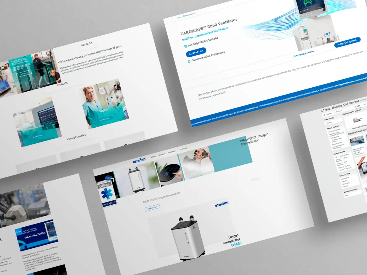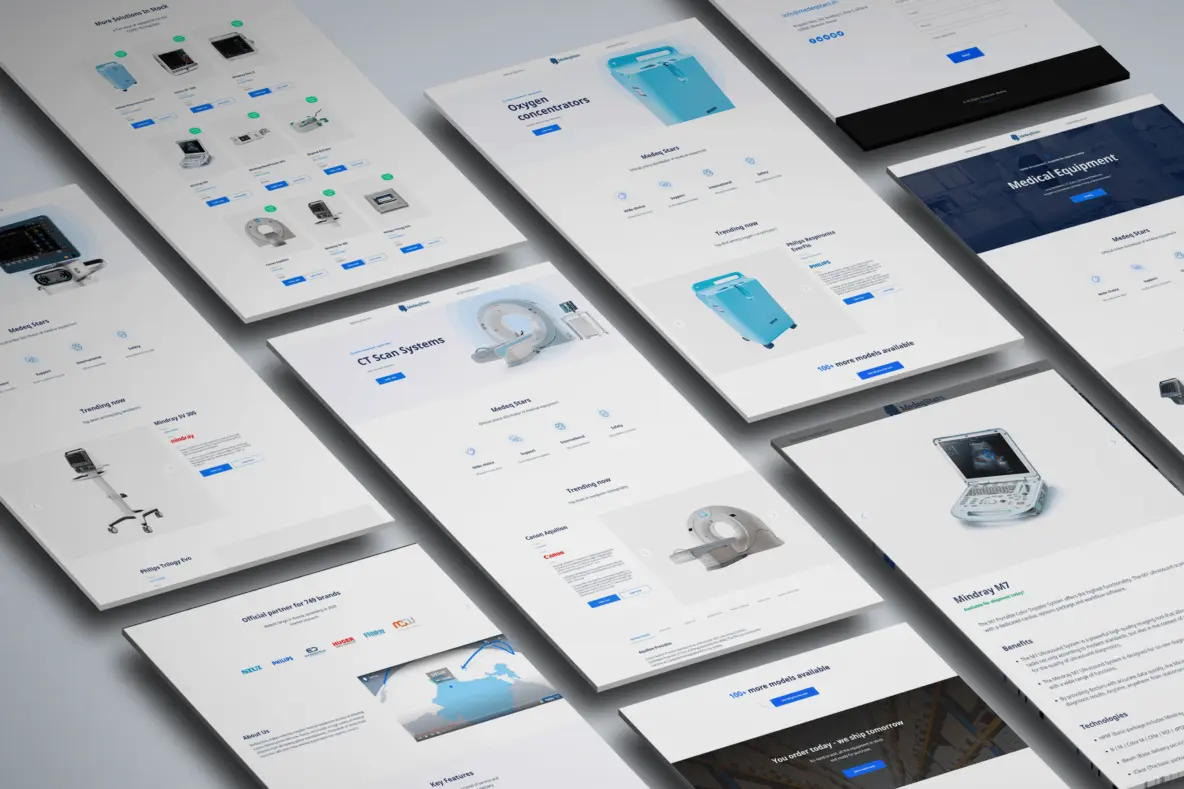 Всего нужно было сделать 7 лендингов: 6 посадочных страниц по отдельным направлениям (примеры: medeqstars.in/ventilators, medeqstars.in/tomography) и одну общую (medeqstars.in), объединяющую весь спектр медицинской техники, с которой можно было бы попасть на профильные страницы.