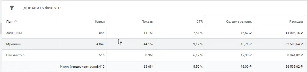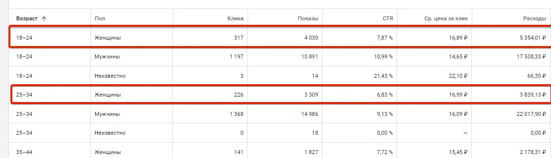 Усредненные, ничем не выделяющиеся показатели. Трендов Google Ads не предоставляет. Отличительной чертой является факт, что женщины немного лучше реагируют на рекламу данного направления. Также трафик равномерно распределился между 18-24 и 24-34 годами. Эту статистику можно использовать при дальнейшем продвижении. Стоит немного переделать тексты (сделать уклон на эмоциональную составляющую). Срез по устройствам характерен для всего аккаунта.