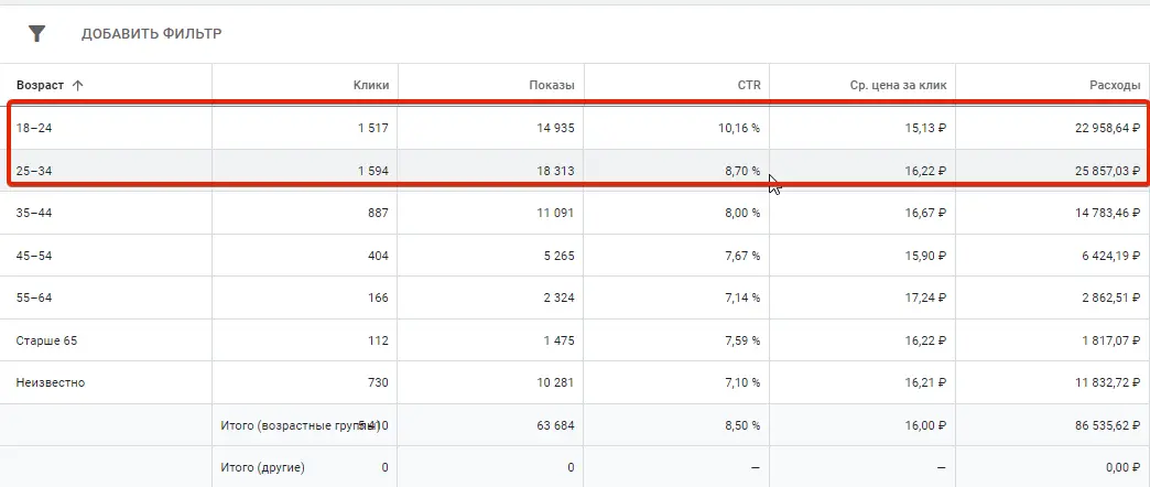 В принципе, по привлеченному трафику это направление не особо отличается от показателей всего аккаунта. Есть незначительный перевес в пользу 18-24 лет. Это может объясняться тождеством с ПК сканерами, сервисами онлайн сканирования и т.д., которые популярны у студентов. Этого мы сможем избежать только по факту более детальной проработки входящего трафика.