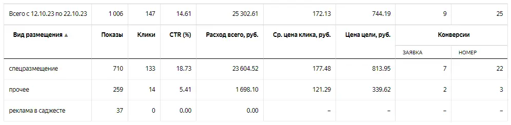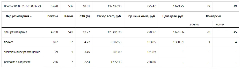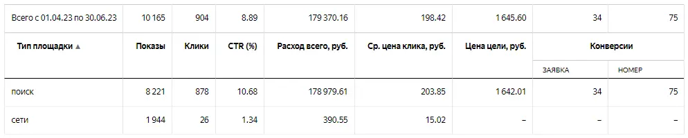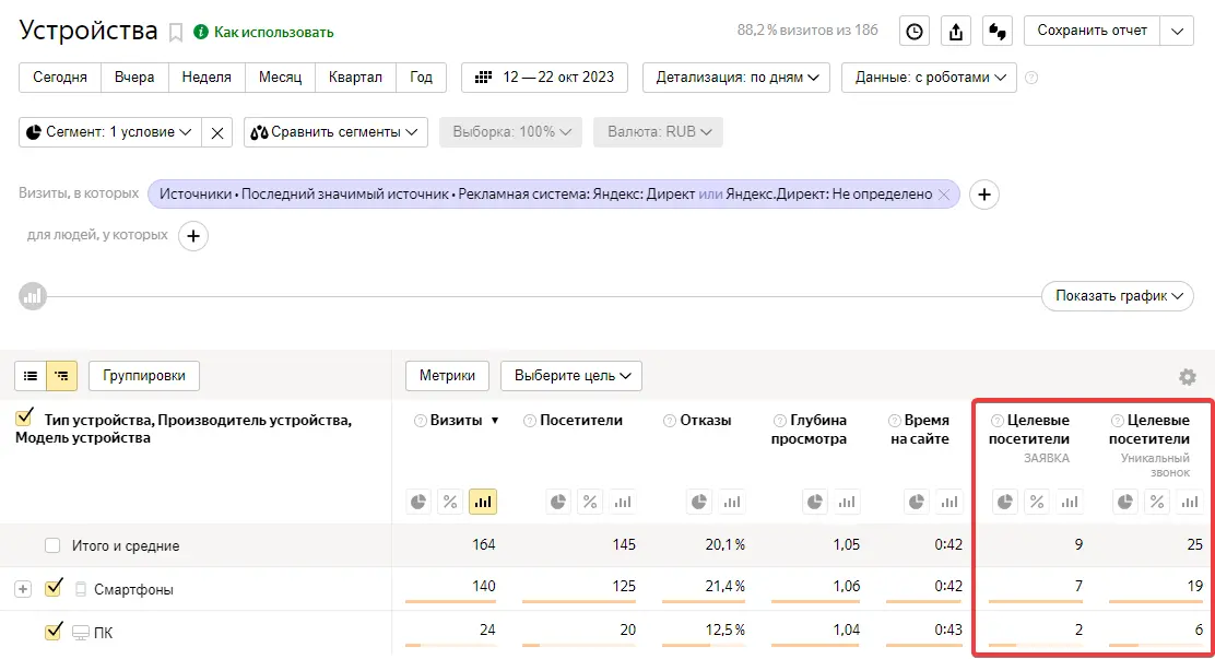Стоит заметить, что если «заявка» — это отправка формы, то «номер» — клик по номеру телефона. Да, это цель, на которую нельзя ориентироваться, необходим коллтрекинг, т.к. у нас, скорее всего, идет большое число звонков. Но в данный момент его нет.