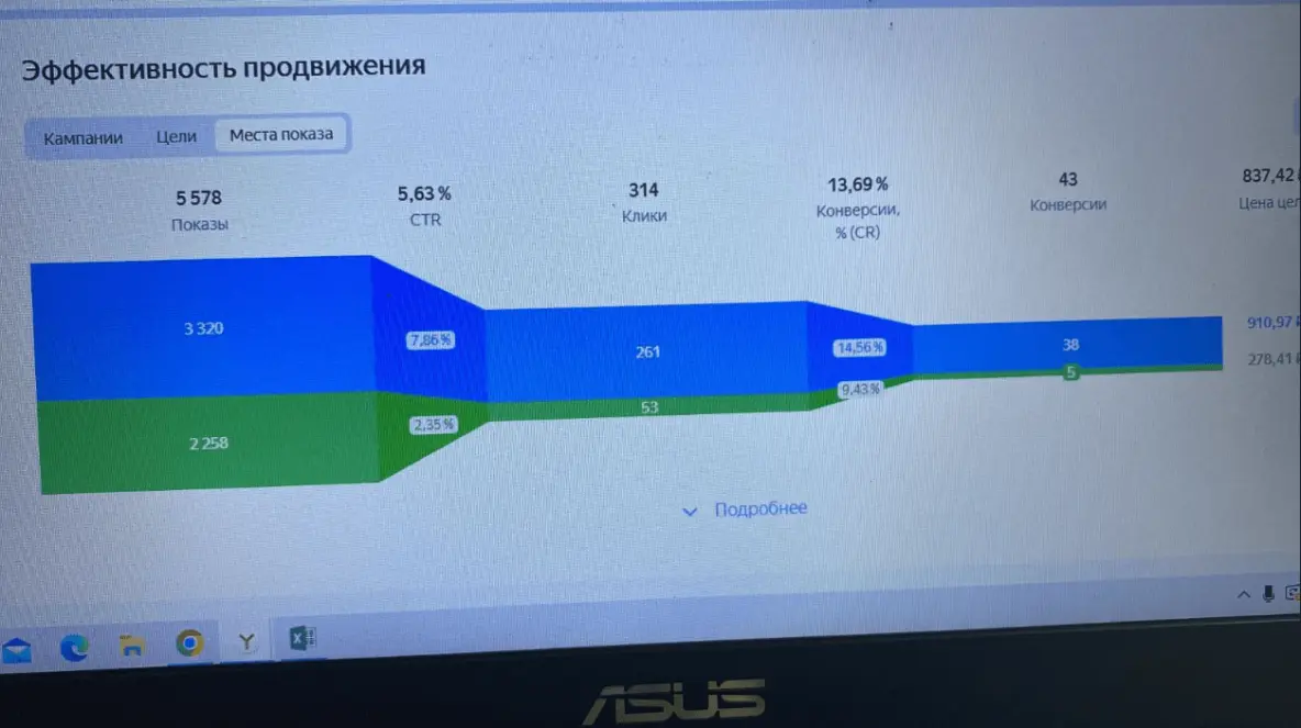 И что мы видим? На ПК 2746₽ расход, 2 формы и 6 звонков от уникальных посетителей. Цена цели: 305 рублей! А пока стояла ставка -40% на ПК, клиент просто не мог видеть конверсий до этого момента.