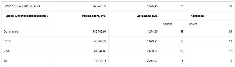 Не все даже знают, что по нему можно корректировать (доступно это только через браузер). И тут мы видим, что заявки «бедного» населения дешевле. Казалось бы — отключаем «богатых» и получаем уже значительное снижение цены лида, но нет.