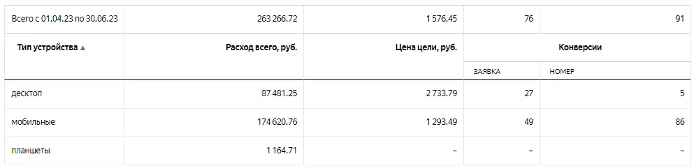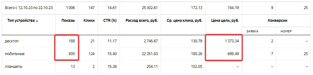 «Мобильные» лиды более чем в 2 раза дешевле, судя по статистике. Но! В начале я писал, что у нас идет не «звонок», а «клик по номеру телефона».