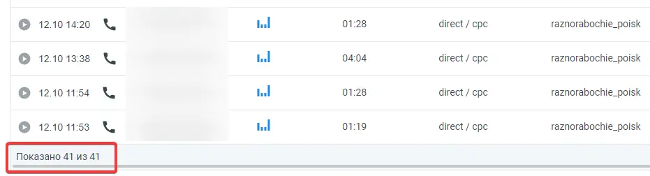 Имеем 41 звонок за 10 дней (напомню, метрика показала 25 кликов по номеру телефона). То есть на деле мы видели только 60 обращений по телефону (и не факт, что все, кто кликал, — звонили).