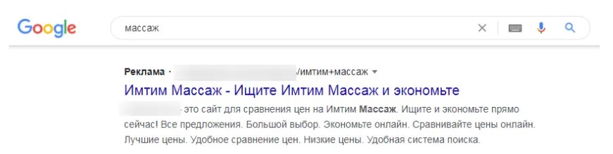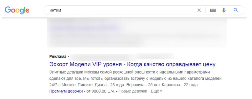 Когда искали, что говорит законодательство по поводу рекламы интим-услуг, на первом месте рекламной выдачи Гугла увидели это: