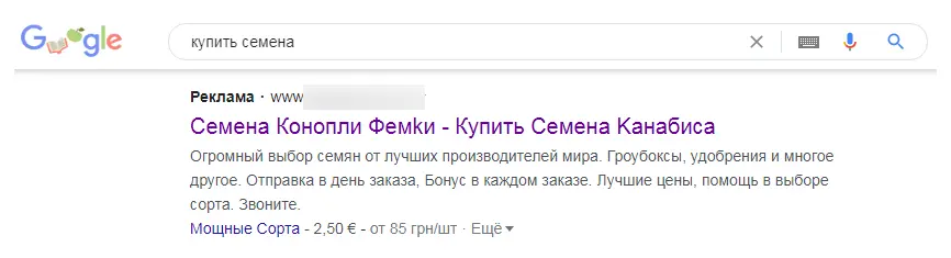 Некоторые умельцы работают через заглушку. Например, по запросу «купить семена» появляется объявление о продаже семян конопли.