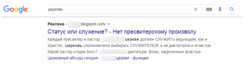 Искать пример долго не пришлось. Первое, что пришло на ум, — запрос «церковь». Так и есть — тон этого объявления уж точно не нейтральный: