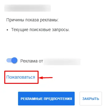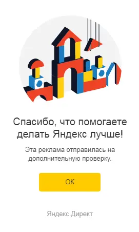 В Яндексе все проще: кликаем по стрелке справа от URL и нажимаем «Спам или мошенничество». Появится сообщение о том, что объявление отправлено на дополнительную проверку.